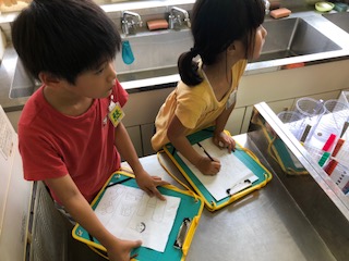 3年生の国語、毛筆書写の授業の様子です。今年は家庭科室を多目的に活用しています。教室よりも机が大きいので好評です。1年生が学校探検に来ています。教室の後ろの方から静かに熱心に見学して様子を絵で表現しています。