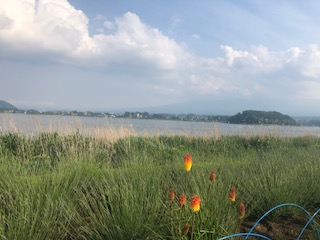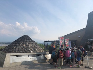 大石公園の「富士山の集いモニュメント」の前で記念撮影をしました。富士山は裾野の辺りだけがうっすらと見えています。今夜のキャンプファイアの会場となる広場を通って学園に戻りました。