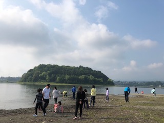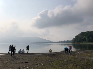 おはようございます。河口湖連合移動教室2日目、さわやかな朝です。6:30に起床して布団の片付けや身じたく、洗面をすませてから湖畔に散歩に来ています。水切りをして遊ぶうちに二枚貝を2つ発見しました。