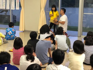 宿舎の1階ロビーでこども会が始まりました。明正小は、はじめの言葉とOXゲームを担当します。芦花小担当のダンス「パプリカ」、祖師谷小担当のゲーム「よつかど」「猛獣狩り」、烏山小担当の歌「にじ」など、どれも皆楽しくて大盛り上がりでした。各校の6年生全員が各自述べた「6年生の言葉」も大変素晴らしかったです。