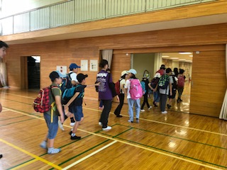 河口湖連合移動教室の閉園式を行うために全15校の学級が体育館に集まりました。