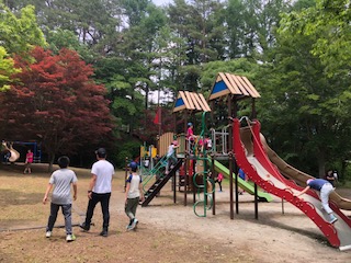 広い芝生とたくさんの遊具で夢中になって遊んでいます。一番人気は鬼ごっこです。猛スピードで走り回っています。