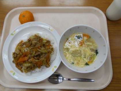ホイコーロー丼 牛乳 とうがんと卵のスープ 冷凍みかん