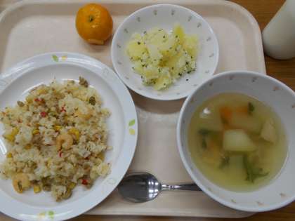 ナシゴレン 牛乳 パセリポテト 冬瓜のスープ 冷凍みかん