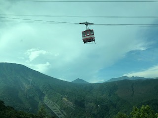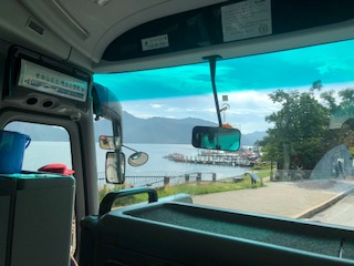 二荒山神社の駐車場からバスに乗り移動中です。中禅寺湖や男体山が素晴らしい眺めです。バスレクを楽しみながらなのでいろは坂もみんな元気でした。