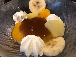 夕食のメニューは、豚すき焼き(白菜・シメジ・エノキ・長ネギ・豆腐・糸こんにゃく・水菜)、温キャベツ・揚げニンジン・レモン・鶏の唐揚げの洋皿、ホタテチーズグラタン、白飯、漬物です。そして食後のデザートはプリンアラモードです。