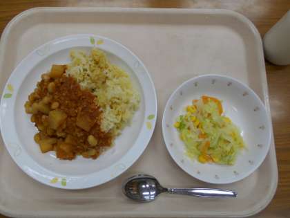 チリビーンズライス コーンサラダ 牛乳