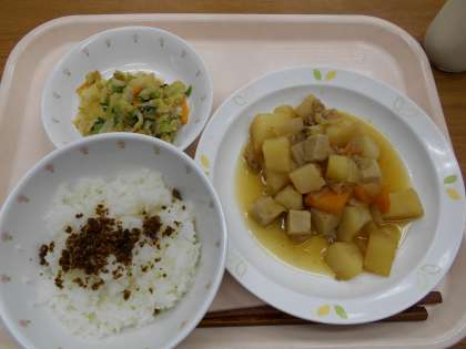ごはん ふりかけ 肉じゃがうま煮 野菜のごま和え 牛乳