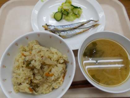 しめじごはん 焼きししゃも 野菜の菊花和え みそしる 牛乳