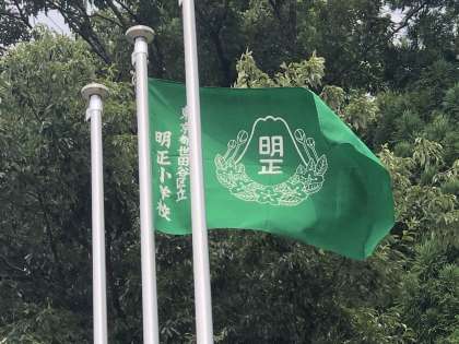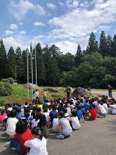 掲揚ポール前で開室式を行いました。この後、いよいよ宿舎棟に入ります。