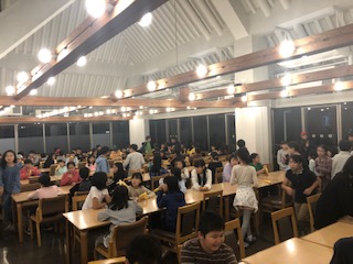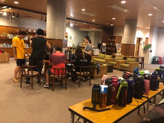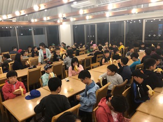 宿舎に戻り夜食タイムです。バナナをいただきました。食堂前では、子どもたち全員の水筒に同行の補助員5名が熱いお茶を注いでいます。反省会、健康観察を経て就寝・消灯は21時です。
