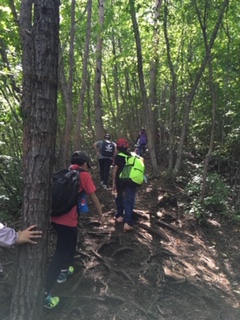 木の根を足掛かりにしたり、木の幹を頼りに上る斜面が続きます。