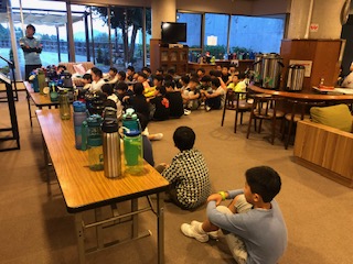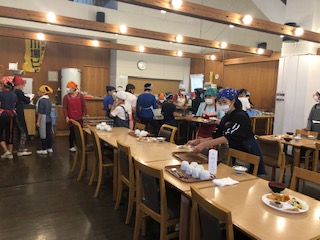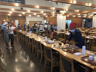 食事係がテキパキと配膳を進めています。食堂前のロビーには5分前行動でみんなが集まってきています。