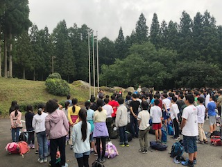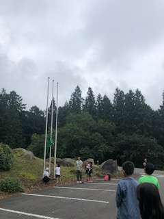掲揚ポール前で閉室式を行いました。明正小の旗を降納しました。