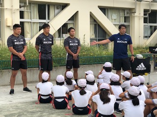 リコーBlack Rams から現役選手3名、OBで普及担当の方1名に来校いただき、6年生がタグラグビーの指導を受けました。児童の感想は「楽しかった」「もう一度やりたい」「ボールを投げるのが難しかった」「ラグビーワールドカップを観たい」などの感想がありました。いよいよ9月20日にワールドカップ開幕です。みんなで大いに応援しましょう!