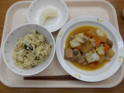 菜飯 豚肉と大根のうま煮 梨 牛乳