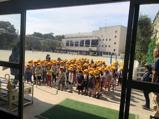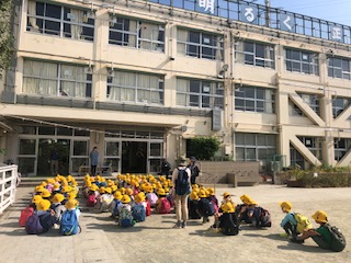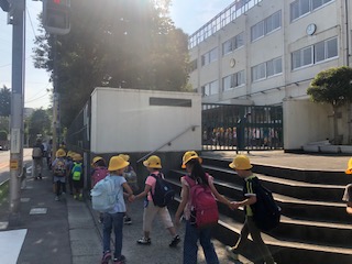 1年生は砧公園を目指して校外学習に出発です。「行ってきまーす」の声が校庭に明るく響きました。