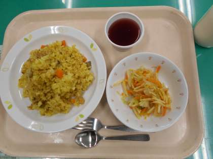 カレーピラフ じゃがいものフレンチサラダ ぶどうゼリー 牛乳