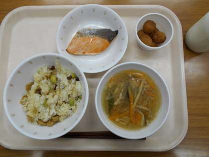 まめまめおこわ 鮭の塩焼き さわにわん 月見団子 牛乳
