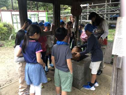 大八車体験の隣りでは井戸の水汲み体験がスタートです。1人ずつつるべで水を汲み上げます。「おもーい」「大変だなあ」「昔の人の苦労がわかる」などなど感想が聞こえてきました。