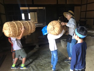 囲炉裏端で休憩をしました。俵かつぎの体験ができた子たちもいました。