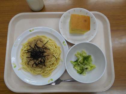 おろしスパゲティ ブロッコリーサラダ ぐりとぐらのかすてら 牛乳