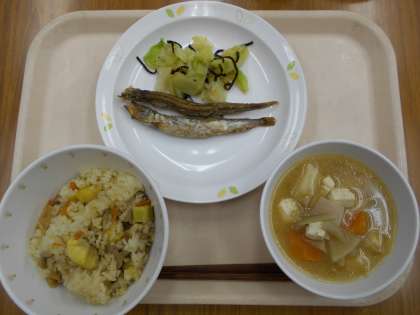 秋の香りごはん ししゃものから揚げ キャベツの塩昆布和え 根菜汁 牛乳
