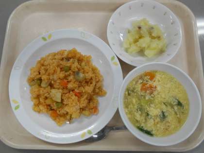 チキンライス チーズと卵のふわふわスープ ジャーマンポテト 牛乳
