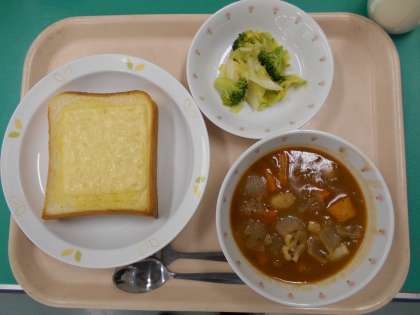 チーズトースト ビーンズシチュー ブロッコリーサラダ 牛乳