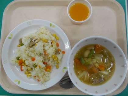 3色ピラフ 白インゲン豆の田舎風スープ キャロットゼリー 牛乳