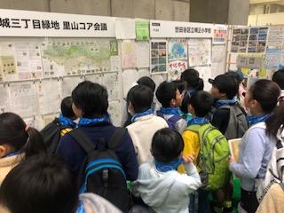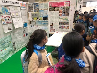 ロビーで注意事項を確認した後、全員で明正小のブースを見に行きました。F-24の本校のブースの隣はF-23 成城三丁目緑地里山コア会議のブースです。両方で明正小の児童の活動を紹介しています。