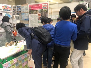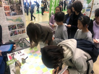 ブース内が混雑してきて、通路でも説明や意見交換が始まっています。周囲のブースの方々には申し訳ないことなのですが、皆さん了承してくださっています。感想の付箋はボードに貼りきれなくなって重ねています。