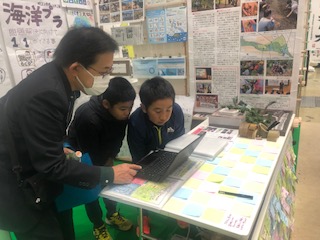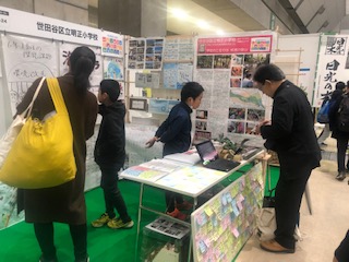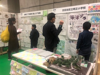 既に明正小のブースに来訪者がいることに気付いた子たちが、急遽、説明役を務めてくれました。事前の準備も打合せも全く無しでも、固くなることなく当たり前のように対応できることに感動を覚えます。普段やったり考えたりしていることだから大丈夫なのだそうです。昨日来てくださった栃木県の授業サポーターの方が「是非今日5年生と話をしたいから」とプレゼンを作成して再度お見えになりました。