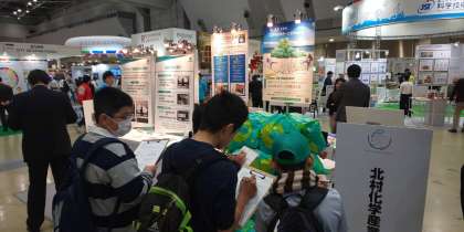 グループで課題をもとに自分たちで決めたブースを熱心に見学している様子です。今年は西ホールの1階と4階の計4つの大ホールが会場となっています。