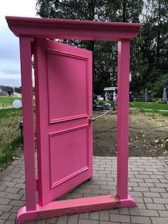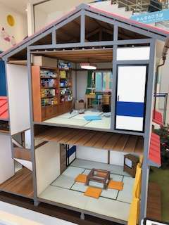 はらっぱの「どこでもドア」、みんなのひろばの「のび太の家」です。そばにタブレットがあり、操作すると家の中にのび太やドラえもんが見えるようになっていました。みんなとても興味をもって交代で操作して楽しんでいました。