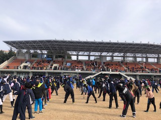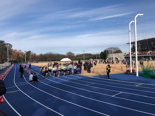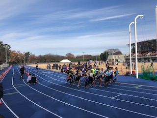 全体でのウォーミングアップが終わり、10時ジャストにスタートしました。砧の学び舎の7つのチームの第1走者はいずれも中学生です。