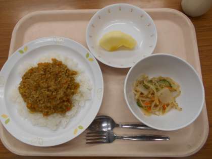 ドライカレーライス こんにゃくサラダ りんご 牛乳