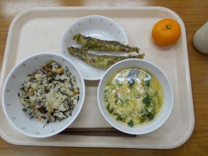 豆入りひじきごはん ししゃものいそべあげ かきたまじる みかん 牛乳
