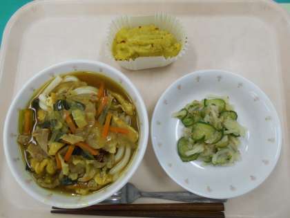 かれーうどん きゅうりと大根のごま風味 スイートポテト 牛乳