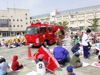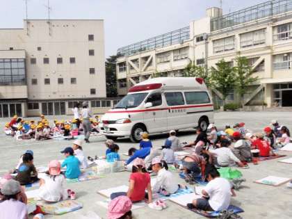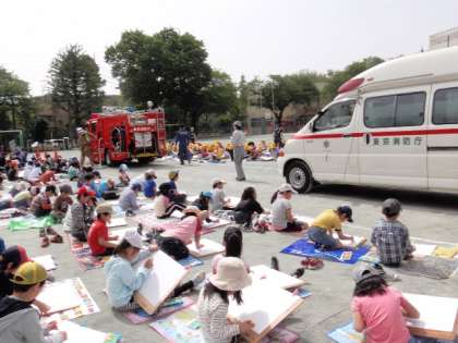 校庭に消防車と救急車がやってきました。1・2年生とひまわり学級の消防写生会です。赤い消防車と白い救急車、そして消防服を着た消防士さん、救急隊員さんも一緒にかきました。大きな画用紙に力いっぱい描きました。
