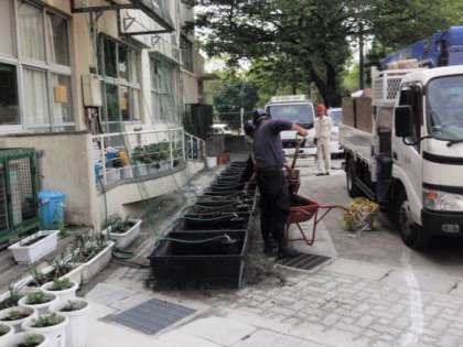 ひまわり学級の前と職員室前の花壇に緑のカーテン準備をしました。