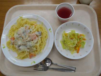 スパゲティクリームソース コーンサラダ ぶどうゼリー 牛乳