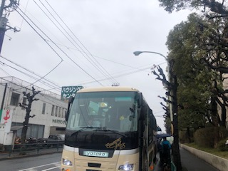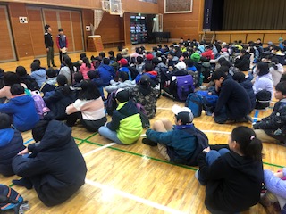 体育館に集合し出発前の確認を行いました。実行委員は計画にも携わってきました。スローガンは「印象に残るいい学び」です。バスは予定通りの時刻に出発です。