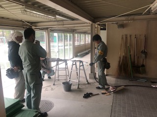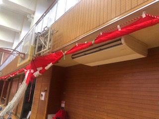 体育館では4月初旬からエアコン設置工事が進んでいます。大きなエアコンが4台取り付けられています。試運転調整は5月の連休明けから中旬にかけて行われる予定です。