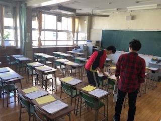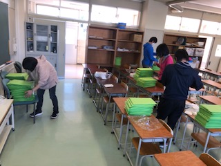 来週5月11日・12日の学習課題等資料配布日に持ち帰っていただく黄緑色の封筒に、布製マスクを1枚ずつ入れました。これは4月7日に閣議決定された緊急経済対策において新型コロナウイルスの感染拡大防止の観点から国による買い上げ及び学校への配布が盛り込まれたものです。今後、もう1枚ずつの配布が予定されております。到着する日程は未定ですが、次回は学校再開後時にお渡ししたいと考えています。