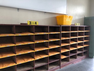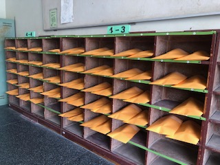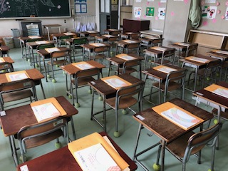 5月18日(月)・19日(火)は、学習課題等資料配布日です。今回は写真のようにオレンジ色の封筒を準備しました。配布場所は前回と同じです。