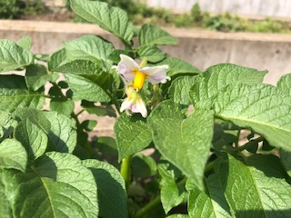 6年生のジャガイモはご覧のように花が咲き始めました。以前に「ジャガイモのいもってなんでしょう?」という問いをこの欄に載せたことがあります。もし「実」なら、ナスやトマトのように、花が咲いたあとにできるということになります。