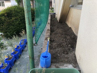 右の写真は、3年生の靴箱の近くに新たに作っているヒマワリ花壇です。今おうちで育てて観察している3年生のヒマワリですが、もし今後、学校に植えたいというご希望があればここにジフィーポットごと植えていく予定です。3年の担任が土を耕して準備をしています。靴箱の近くなら登下校の際にいつも様子を見守れると考えて、この場所にしました。学校が再開してから植えてもよいし、既に十分に育っているようならいつお持ちいただいても構いません。もちろん、おうちで地植えできれば、或いは大きな鉢やプランターなどに植えていただけるなら、お子さんの身近で栽培を続けていただくことが何よりです。急ぎませんのでご家庭でご相談ください。