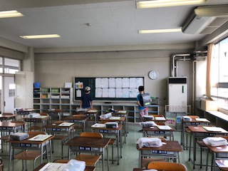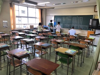 今日明日の学習課題等資料配布・提出日は教室が受け渡し場所です。担任が教室でお待ちしています。級友が提出した新聞形式の作品の掲示に見入ったり、課題の取り組みについて担任と相談したり、「こんなクラスにしたい」とホワイトボードに子どもたちが自分の意見を書き合ったりなど、様々なアプローチがそれぞれの教室で展開しています。担任の創意ある取組を嬉しく思います。「密」の状態を避けながらでも級友の存在を感じ合うことはできるものです。学級への所属感を少しずつ積み重ねて行けそうな、そんな手応えのある1日となりました。担任が作品を教室内や廊下に掲示したり、みんなが頑張って取り組んだ提出物に目を通したり、学級通信を作成したりしながら、子どもたちの登校を待っている、そんな1日になりました。教室内の児童机は写真のように間隔をあけています。「新しい生活様式」を探りながら学校再開に向けて準備をしています。