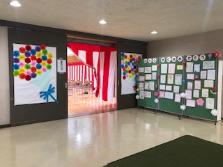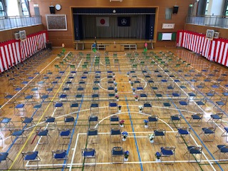 会場は写真のような構成になっております。晴天の場合は靴のまま入場ください。登校前に検温し体調を確認いただくともに、受付カードをご持参くださるようお願いします。